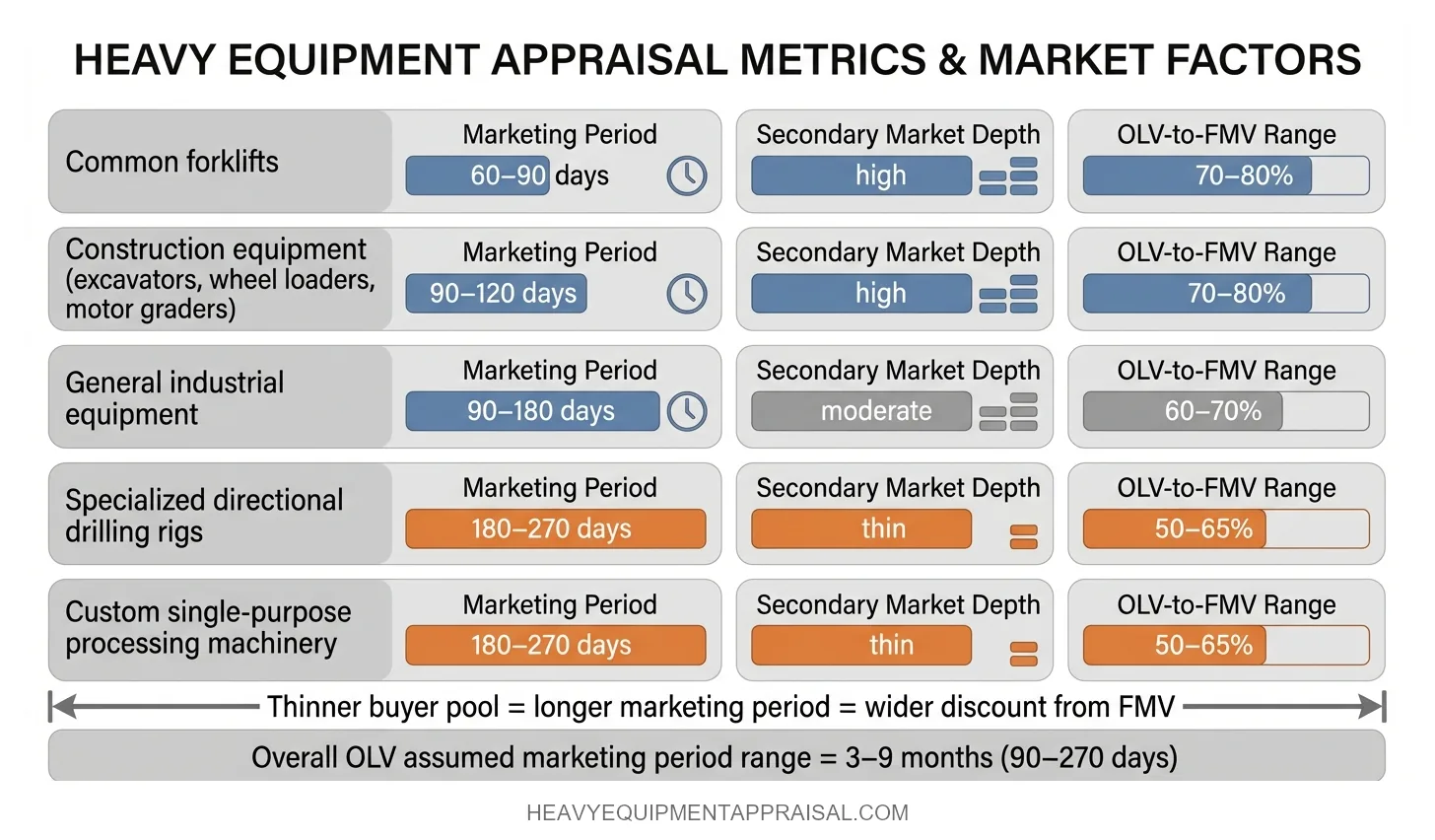 The assumed marketing period typically ranges from 3 to 9 months depending on equipment type and secondary market depth. A fleet of common forklifts may reach full OLV exposure in 60 to 90 days. A specialized piece of directional drilling equipment may need 6 to 9 months to reach the buyer pool capable of paying OLV.